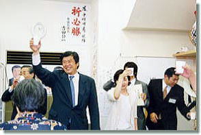 中村夫婦と、かけつけた多くの支援者と勝利の乾杯