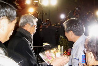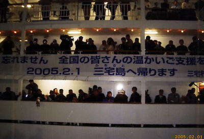 三宅島島民3200名の内、帰島を希望している方約2000名の中で今回第一陣約100名の方々が「さるびあ丸」に乗船し、石原東京都知事をはじめ国の防災担当大臣、都議会議長、各会派幹事長や多くの都議会議員、都の職員が見送る中、寒風にもまけず出発をしました。